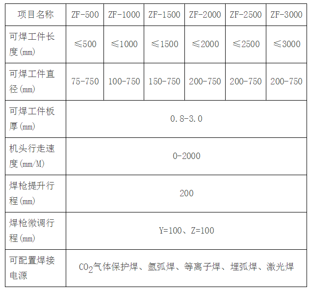 應用范圍:技術參數項目名稱ZF-500ZF-1000ZF-1500ZF-2000ZF-2500ZF-3000可焊工件長度(mm)≤500≤1000≤1500≤2000≤2500≤3000可焊工件直徑(mm)75-750100-750150-750200-750200-750200-750可焊工件板厚(mm)0.8-3.0機頭行走速度(mm/M)0-2000焊槍提升行程(mm)200焊槍微調行程(mm)Y=1